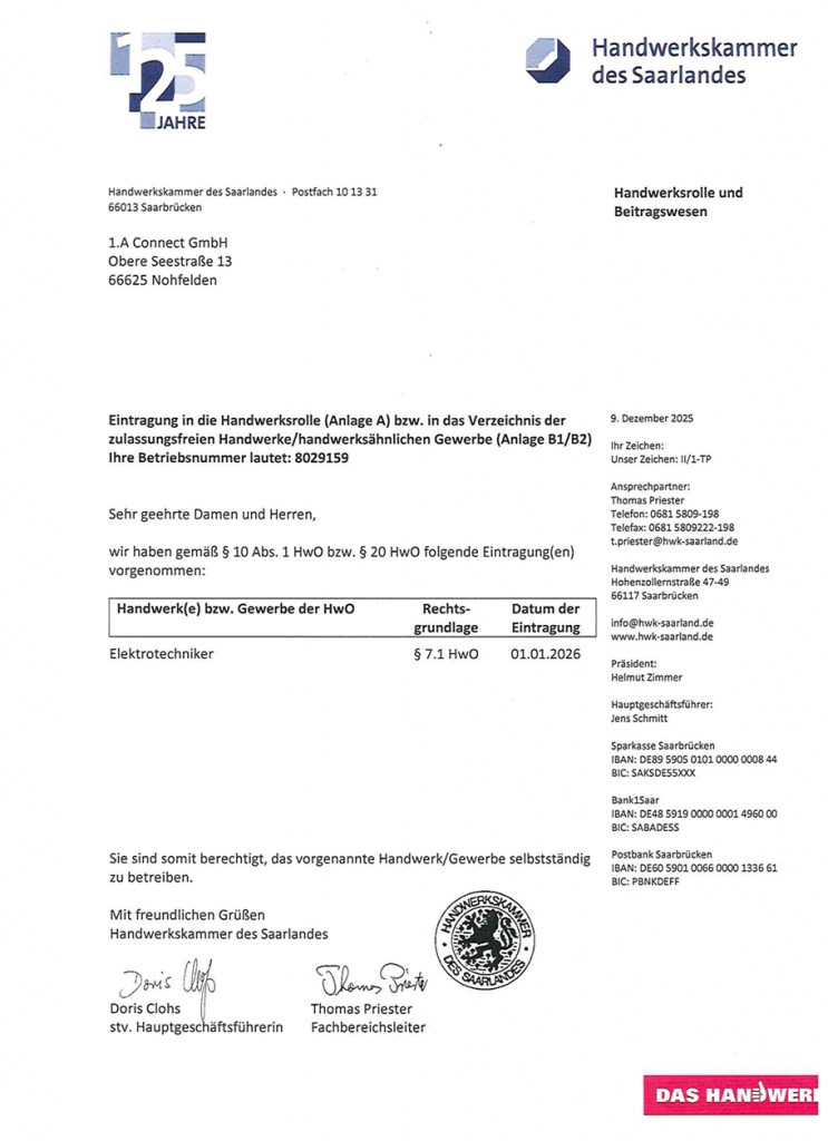 Die 1.A Connect GmbH ist ordnungsgemäß in der Handwerksrolle der Handwerkskammer des Saarlandes als Elektrotechnikerbetrieb eingetragen.